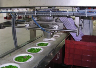 Filling of products into trays formed by a thermoforming machine or into trays on a step conveyor. Cans, glass jars, boxes etc. will be filled in fixed positions