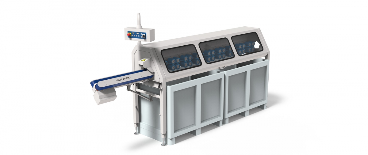The knife stations and the transport rollers are equipped with a quick release system, which allows easy removal for replacement or cleaning etc. The peeling waste will drop into bins beneath the machine.