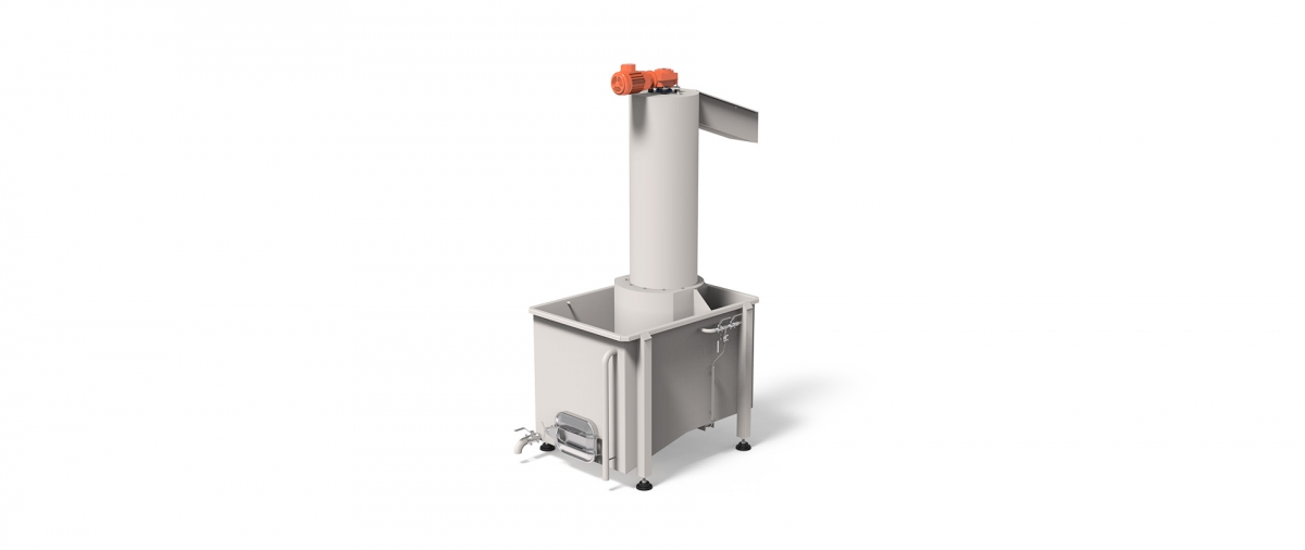 The rotational action raises the product allowing the water to gravitate down the side of the auger. Heavy particles with negative buoyancy remain on the bottom of the hopper. Clean product (without stones) are transported out off the upper side of the transport screw.